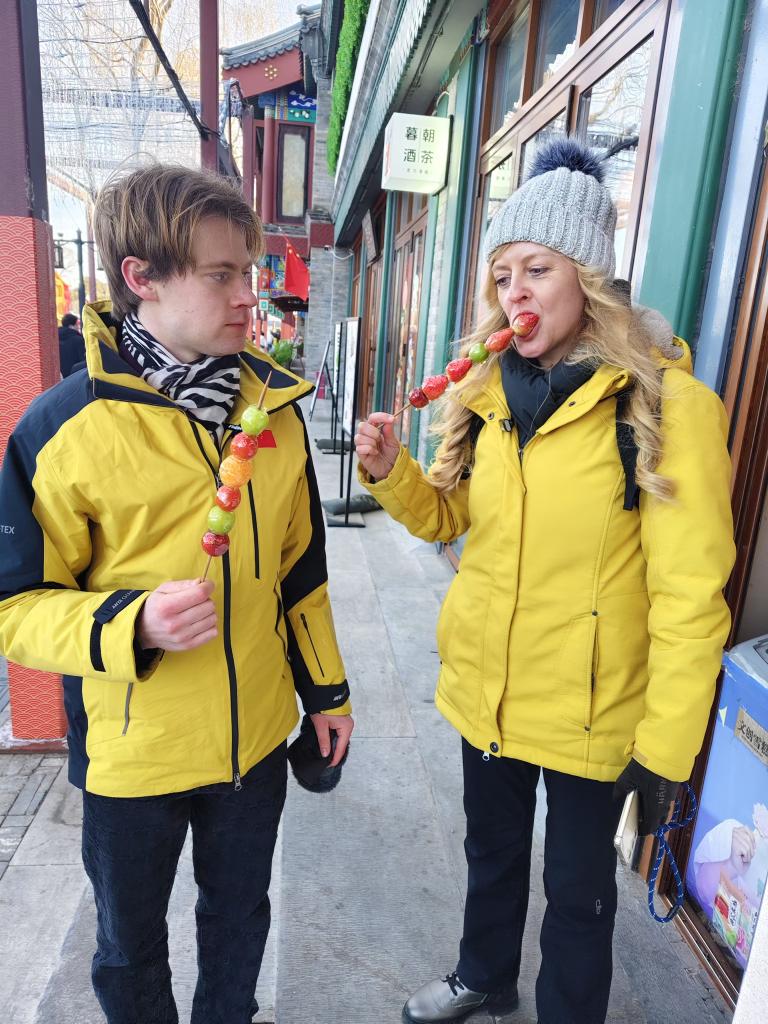 德国游客乌尔丽克与埃米尔在什刹海吃糖葫芦。新华社记者于佳欣摄