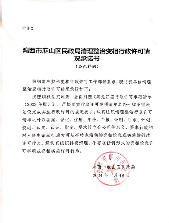麻山区民政局清理整治变相行政许可情况承诺书